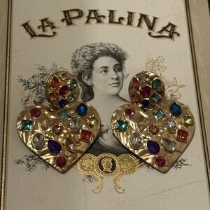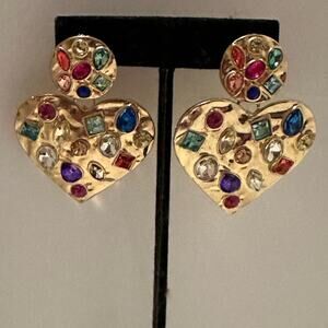 🌟🌟HOLIDAY🌟🌟READY GOLD TONE HEART EARRINGS BEDAZZLED w/FAUX COLORED STONES NEW