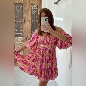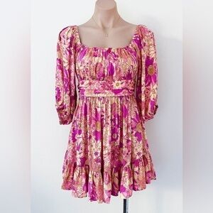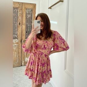 Featuring 3/4 sleeves that can be worn on or off the shoulder, a cinched waistband, frill hemline, a pretty pink floral print, an invisible zip up closure and a stunning tie up back.