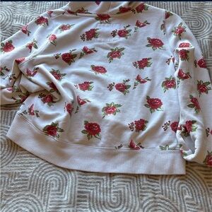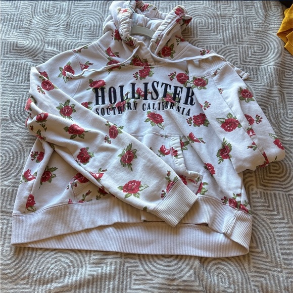 Hoodie is a little cropped. Ends to hoodie strings are a little distressed