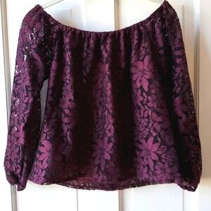 HOLLISTER BURGUNDY LACE OFF-SHOULDER PEASANT TOP SIZE SMALL FALL ROMANTIC