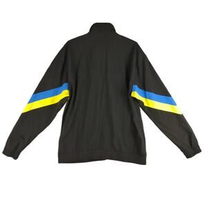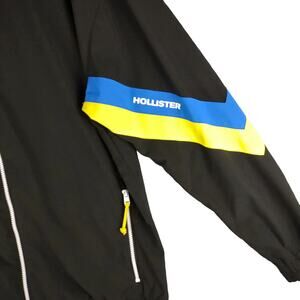 This Epic Flex jacket from Hollister features a black outer with yellow and blue stripes on the sleeves, lightweight material with mesh lining, full zipper closure, side vents, elastic bottom hem, two zippered side pockets, long sleeves with elastic cuffs, and a collared neckline. Shell is 90% Polyester, 10% Elastane with 100% Polyester mesh. Machine washable.