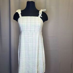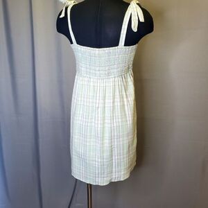 The "HOLLISTER Green Mint Plaid Mini Dress" is a sleeveless dress in medium size. It likely features a pastel green mint-colored plaid pattern and is designed to be shorter in length, falling above the knee, perfect for summer and spring, Tie Straps, No Flaws.