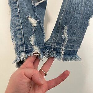 -details - intentionally faded whiskered distressed / lots of large distressed rips ripped on both front and back / cropped crop ankle length / raw fraying unfinished hem / has stretch