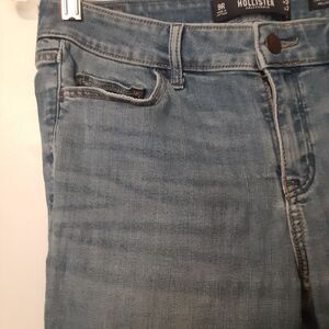HOLLISTER Women's Skinny Jeans in Size 9R, featuring a distressed blue denim fabric with a solid pattern. The jeans have a low rise and zip closure, accented with buttons and zippers. Made of a cotton blend material, they have a slim fit and ankle-length style. The design includes the Hollister logo and is suitable for everyday wear.