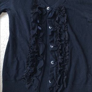 Navy Blue button up cardigan with ruffles at the button closures. In great condition