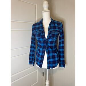 HOLLISTER Size XS Long Sleeve Button Collar Blue Red Plaid Striped Y2K