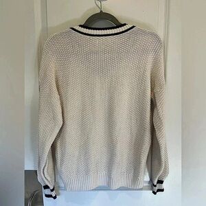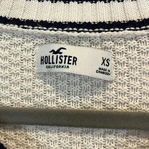 This stylish Hollister XS V-Neck sweater features a cable knit texture with elegant ivory and navy blue accents. It's perfect for a preppy, classic look.