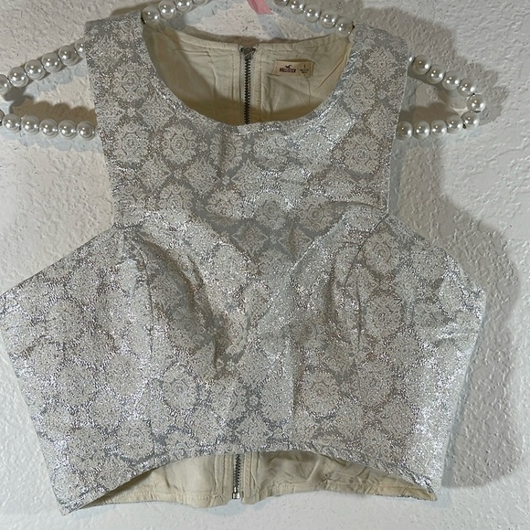 HOLLISTER White, Metallic Silver Sparkly Baroque Print Zip Sleeveless Crop Top Size Small NEW