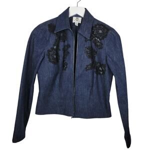 Jacket is full zip, tailored, black lined lace inset, 96% cotton; 4% Lycra