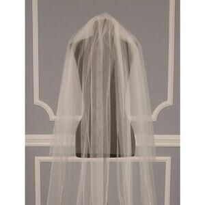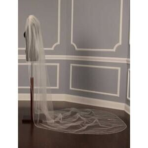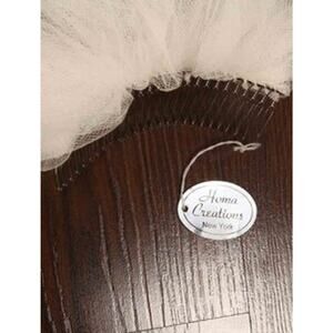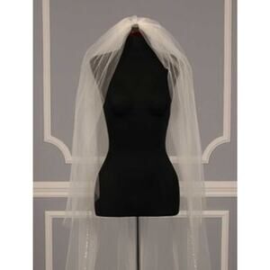This beautiful Homa Bridal 96L bridal veil is New with its designer hang tag attached! The silver-backed crystals, pearls, and silver beading on the edge and throughout are gorgeous! The additional Swarovski crystal flower accent on the center back bottom of the veil is simply stunning! Such a beautiful veil to wear down the aisle with any white or diamond white wedding gown!