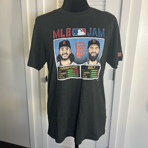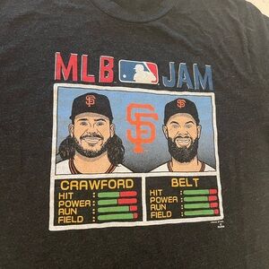 Black unisex tee with MLB Jam graphic. Features Brandon Crawford and Brandon Belt from the San Francisco Giants in a video game style design. Ideal for baseball enthusiasts.