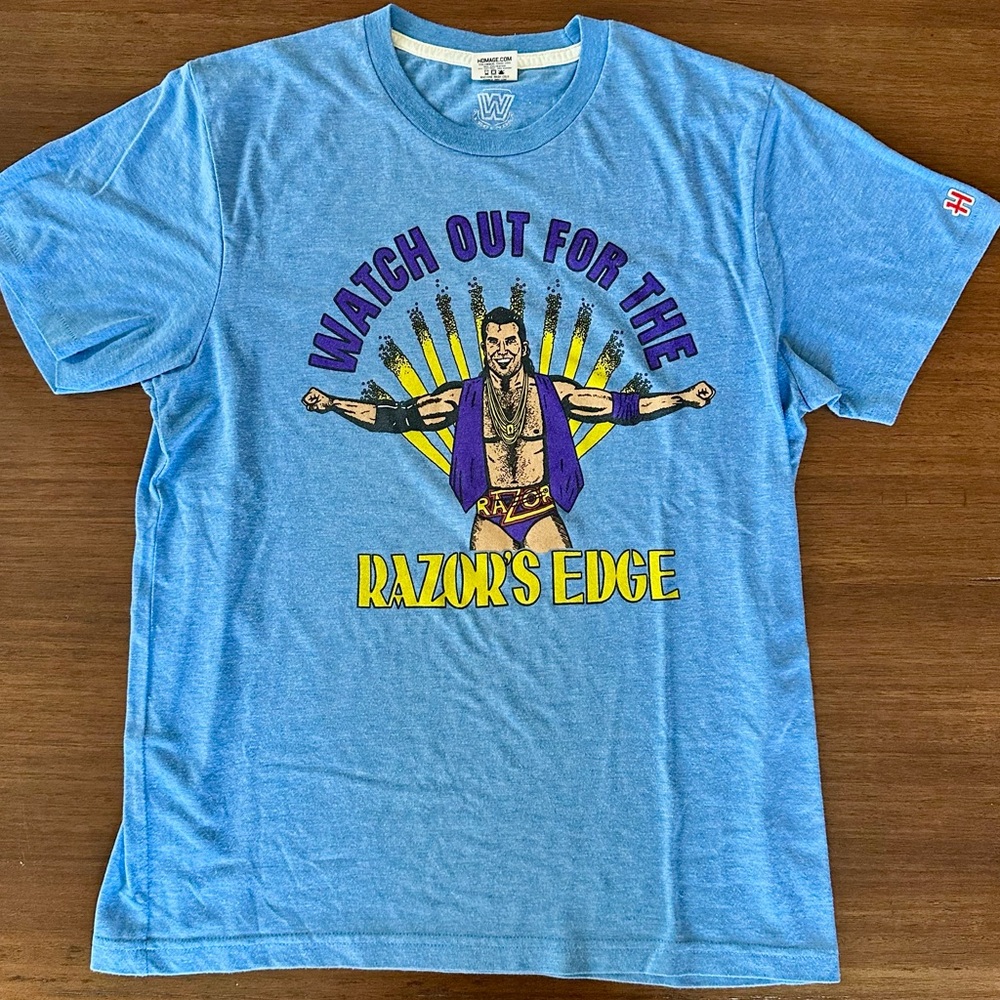 This is a super soft t-shirt from HOMAGE with a graphic of Razor Ramon across the front. The HOMAGE “H” is embroidered on the left sleeve.