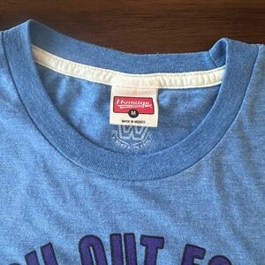 Shirt is light blue, made of a 50/25/25 poly/cotton/rayon blend, and in excellent condition. Size is a medium. Please see approximate measurements below: