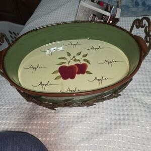 HOME INTERIORS APPLE ORCHARD COLLECTION CASSAROLE SERVING BOWL & METAL CARRIER