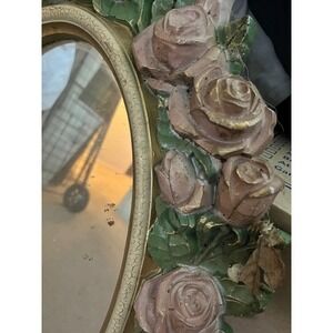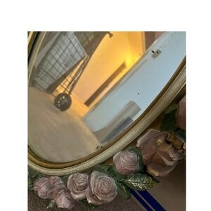 Keywords: Oval Mirror, Rose Frame Mirror, Floral Mirror, Home Interiors Mirror, Cottagecore Decor, Shabby Chic Mirror, Vintage Mirror, Decorative Mirror, Wall Mirror, Pink Roses, Green Leaves, Accent Mirror, Bedroom Decor, Living Room Decor