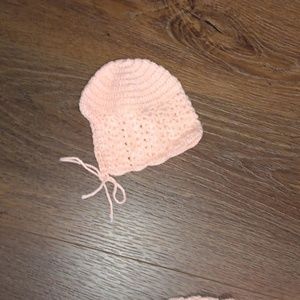Peach color knit cardigan and hat.. tie at neckline.. tie closure on bonnet... homemade..