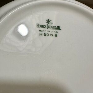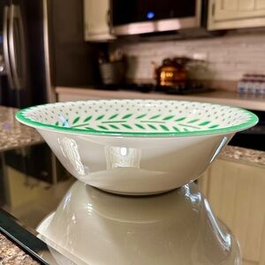 HOMER LAUGHLIN, VINTAGE, “VIRGINIA ROSE”, SERVING BOWL. WHITE WITH BRIGHT GREEN TRIM. FLORAL BOUQUET DECORATES BOTTOM OF BOWL. HAS CHIP ON UNDERSIDE OF RIM. 9 3/4”W X 3”H