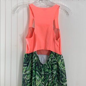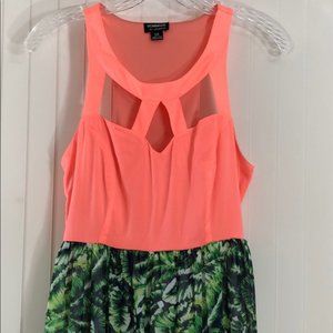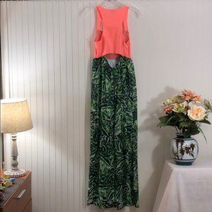 HOMMAGE Coral Keyhole Cutout Green Leaf Print Hi-Low Sheer Skirt Maxi Dress Size S