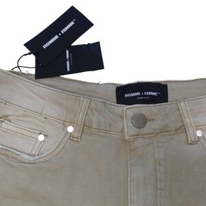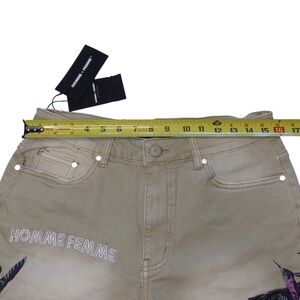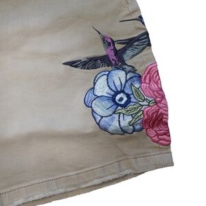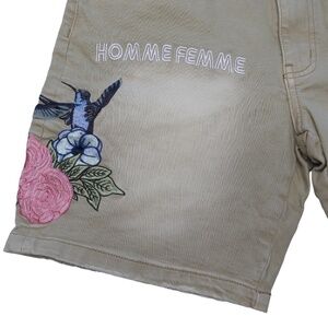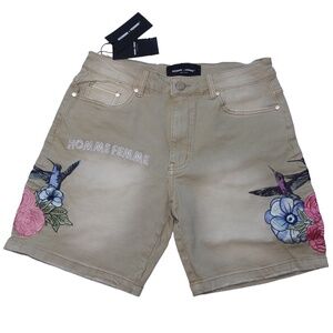 New With Tags HOMME + FEMME LA Women's Khaki Denim Shorts. These stylish shorts feature embroidered logos on the front and back, along with gorgeous embroidered flowers and hummingbirds.