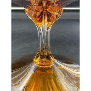 This is a gorgeous Mid Century Hand blown Honey Amber Empoli Glass Apothecary Candy jar with circus tent lid, Honey Amber/clear glass stem and base. It stands approximately 13” tall with its lid on. The circumference of the bowl measures 21 1/4” at its longest distance around.