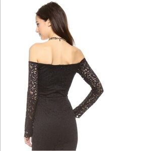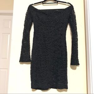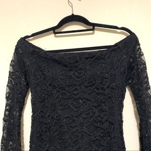 An beautiful off-the-shoulder Black sparkling dress rendered in lace.