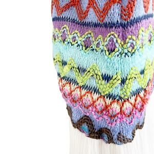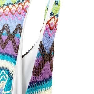 Beachy, boho dress perfect for your next Hawaiian vacation. Sleeveless with racerback. Bodice features intricate multicolor fair isle embroidery in chevron stripes, while skirt is pure white crinkle gauze. Bodice and skirt are lined down to approximately the knee.