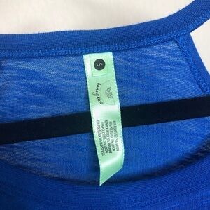 Size small. Blue with semi sheer burnout white sleeves and cutout detail at the neck. Pink graphic print “American Made” on the chest. Super soft, cozy, and stretchy. Slits on the sides. Rounded hem.