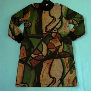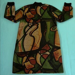 HONGJINGLING midi long sleeve dress 2 side pockets, rib knit mock neck and cuffs. Elevate your wardrobe with this abstract patterned long sleeve dress. Featuring a blend of green, black, and brown hues, this dress is perfect for any occasion. Its unique design adds a touch of sophistication to your style, the outside feels like wool, the inside feels like a blanket! Very soft, warm, cozy blanket dress.