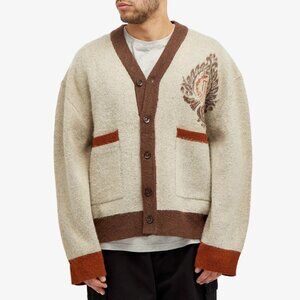 A men's knit cardigan sweater by HONOR THE GIFT featuring a classic V-neck and button-down front. This stylish piece showcases a prominent crest emblem on the left chest and a larger coordinating emblem with a rose detail on the back. Contrasting brown trim accents the neckline, pockets, cuffs, and hem, adding a touch of refined detail to the tan marled knit.