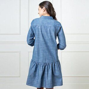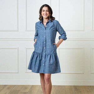 Our long sleeve organic cotton chambray shirt dress combines classic details such as a pointed collar, full button front placket, side pockets and a gently flounced drop waist to create an everyday stylish look.