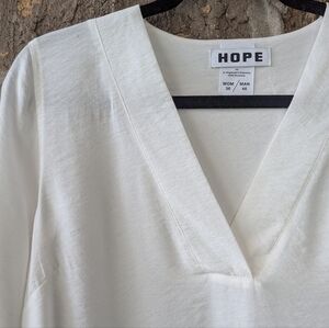 Great preowned condition bright white Dive Shirt from HOPE Stockholm. Split V neckline. Long sleeve with button cuffs. Curved hem. 87% viscose 13% polyamide. 2 tiny spots : one on front shoulder (3rd picture), one on back shoulder (5th picture). Machine washable. Clean.