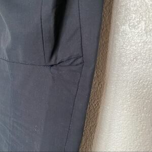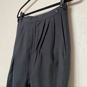 Pleat front trousers from HOPE by Ringstrand Söderberg Stockholm. Very dark navy, almost black. Zipper and hook closure. Hook is pulling away from pants (pictured). Seam details on the backs of legs (pictured). Hip pockets. Flap detail on one back pocket. Botton detail on left side of waist. EU size 36.