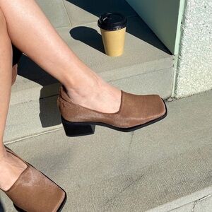 The Bare Loafer is a low heeled loafer-pump hybrid. It has a distinct yet classic square toe with an overextended outsole lip -- our favorite detail. The upper is made with a calf hair leather.