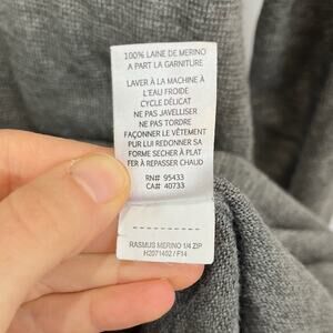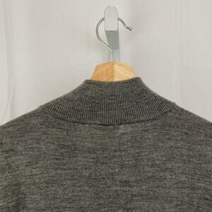12-gauge knit; quarter-front zipper; contrast color at neck interior and underside of cuffs, fairly slim fit. 100% merino wool in gray.