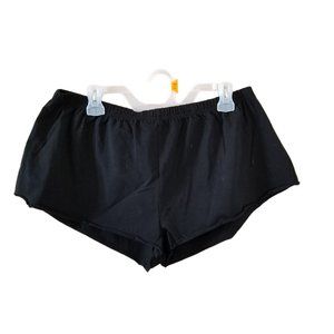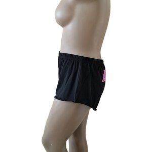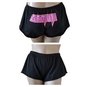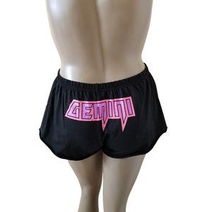 Color is Black, Size is XXL, Plus Size. Stretchy, lightweight Cotton/Spandex blended jersey. Elastic waist and rolled/raw hemlines around the thigh. Front is plain. Backside has a large 70's superhero type of graphic in Candy Pink & Lilac Purple that says "Gemini". Perfect for jogging, walking, comfort, gym, lounging or sleeping.