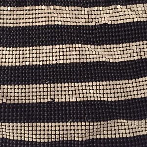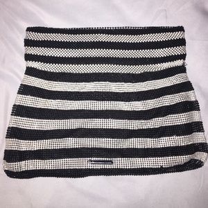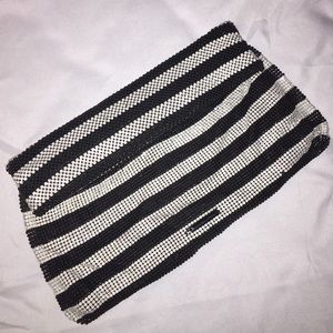 Fold over mesh clutch with zipper closure at top. Black/White mesh stripe can add a statement to your outfit! There is a fabric lining with extra small zipper compartment inside. Some flaws in the mesh fabric. Comes with original dust bag.