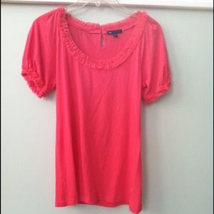 Super cute salmon pink shirt with frilled piping around neckline and sleeves. 3/4 sleeves with piping give an extra puff. shirt fits a little long so perfect to wear with leggings and a belt! :)