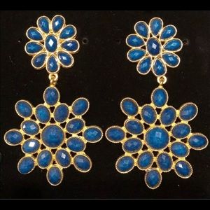 Amrita Singh East Lake Morning Earrings. A gold tone brass chandelier earring featuring a floral motif, and encrusted resin stone embellishments. Post. 3.25”L x 1.75”W.