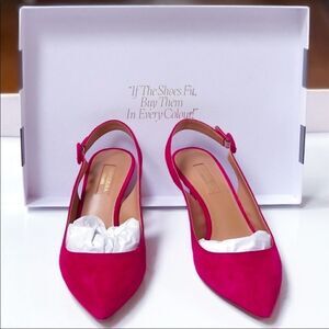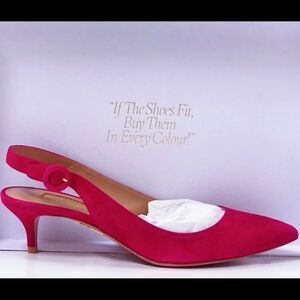 Aquazzura's Pure 45 slingback kitten heels balance bold hues with a classic silhouette, making these a go-to when you need a pop of color. Made from supple suede that is super saturated in rich Cabaret Pink, an elegant pointed toe is paired with a classic slingback strap and round covered buckle for a clean & modern look. Features a covered 2 inch heel that is finished with a rubber heel patch at the leather sole. Wear yours with tailored separates or a flirty top and jeans. Made in Italy.