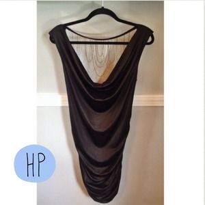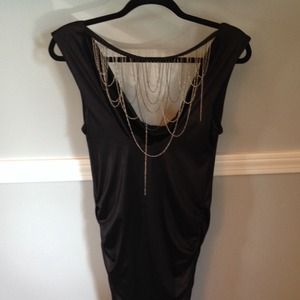 Sexy black dress with ruching on the front and chain detail on the scoop back. This was worn once, but the chains got tangled when I packed it and 2 of the chains broke on one side as seen in picture 2. Very easy to either repair or remove chains without being noticeable. โจHost Pick 7/19 - City Chicโจ
