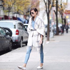 I loved this cape!!!! It's perfect. It's made of soft acrylic yarn. The first pictures are the cape on Danielle Bernstein of We Wore What. Frankly. She's the reason i bought it haha. I paired it with long sleeve shirts and jeans and leather booties. There is a little wear at the end of the fringe. But it's really not noticeable.
