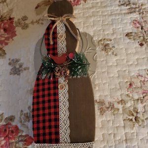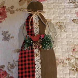 **HOST PICK** Farmhouse style wooden winter angel with tin wings, cloth gingham, buttons & lace trim with Cardinal on evergreen & berry branch. The jute bow adds a rustic country look to this.