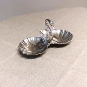 This Vintage Swan silver plated serving dish is from the 1950's. It has a Swan figurine in the center that can also hold a serving spoon. There are two clam shell shaped serving bowls on each side, and is footed. You can serve candy and nuts, or appetizers.