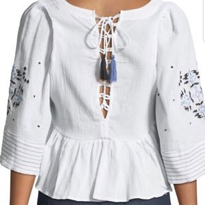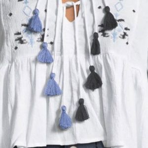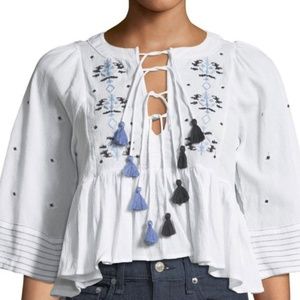 Item: NEW WITH TAGS Haute Rouge White Embroidery Boho Chic Kimono Blouse with Tassles, Medium.