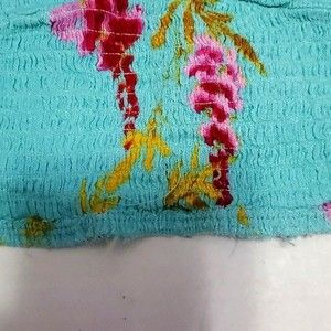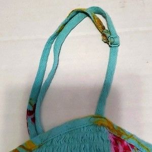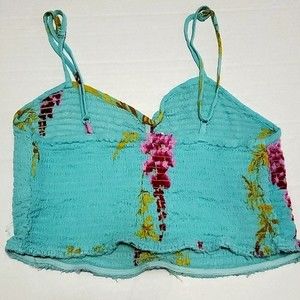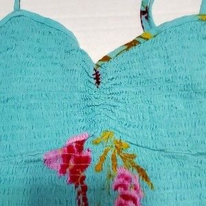 Light teal bralette crop top with tropical floral print. Sweetheart neckline with some ruching.. Adjustable spaghetti straps. Smocking construction.