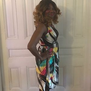 This dress mixes comfort and style in one. Tie waist, it can go from work to play. Stretchy, so runs large.