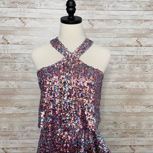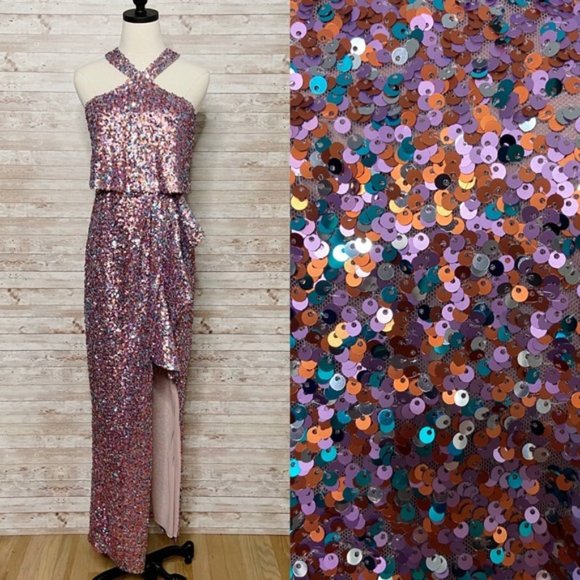 Sleeveless full length multi-color sequin dress, halter neckline w/ cutaway shoulder, blouson bodice, front thigh high slit w/ ruffle detail, lined, invisible back zip w/ hook & eye closure. Snagging on bodice lining from sequins.