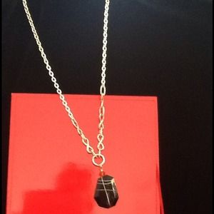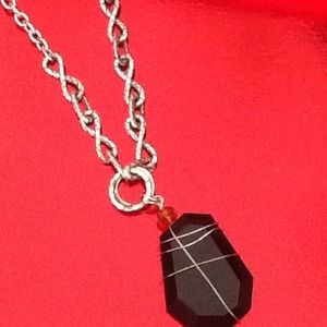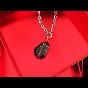 BEAUTIFUL SILVER TONE NECKLACE WITH BLACK STONE WITH WIRE WRAPPING. LOBSTER CLAW CLOSURE. THE CHAIN IS PARTIALLY INFINITY DESIGN, WHAT A STATEMENT👍