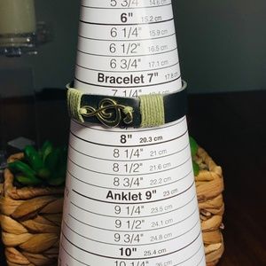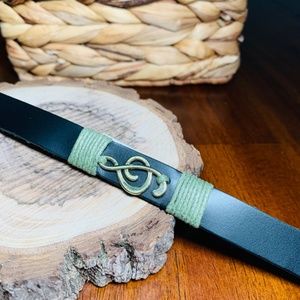 Treble Clef Black Vegan Leather and Moss Green Cord Bracelet, with Brass hardware. Size 7.75”