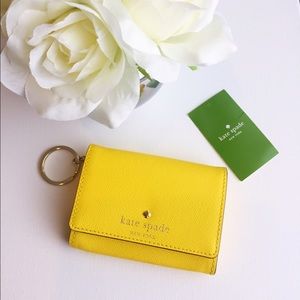 ///////4.99 Shipping ends at 7:45pm EST /////////. Gorgeous Zesty Summer Shade! Lustrous crosshatched leather defines an elegant uptown wallet detailed with polished goldtone hardware. Snap-button closure. Exterior ID window, slip pocket under flap. Interior zip pocket; key ring. Signature print lining. Leather. By kate spade new york; imported. Size 4 ½"W x 3 ¼"H x ½"D. Retails around $93